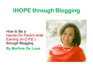 Martine De Luna was the speaker for #iHOPE through Blogging. Martine is an award-winning blogger, a work-at-home advocate, and a creative blogging mentor. She also offers digital strategy on community building, blog branding, and social media on her professional site, Martinedeluna.com. She lives in Manila, Philippines, with her husband Ton and her son Vito, whom she homeschools, and her daughter Krista, whom she breastfeeds.